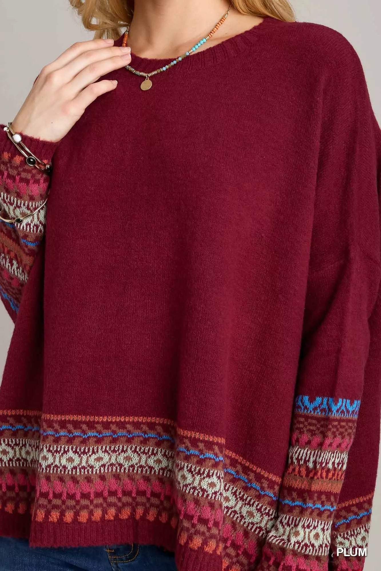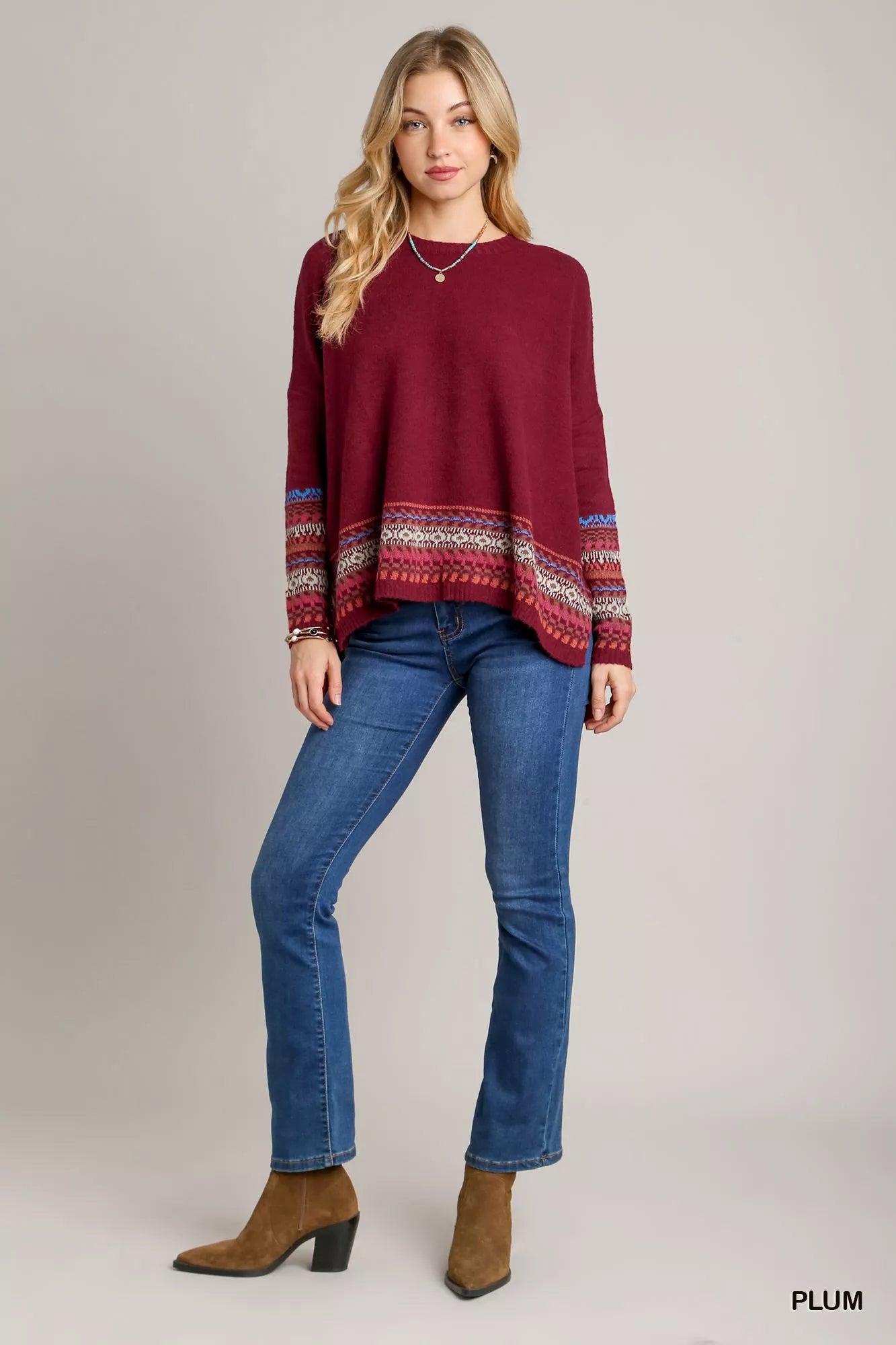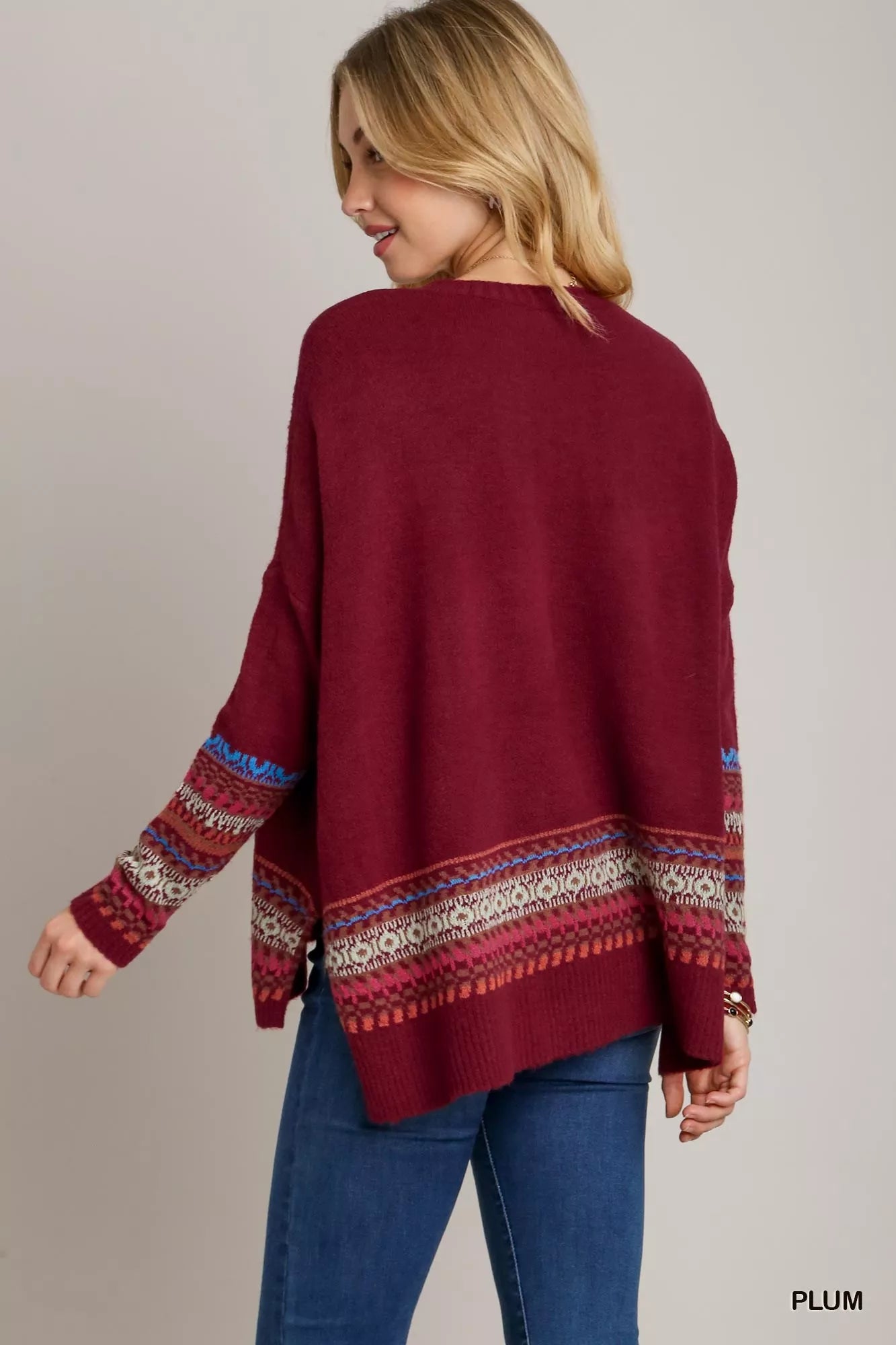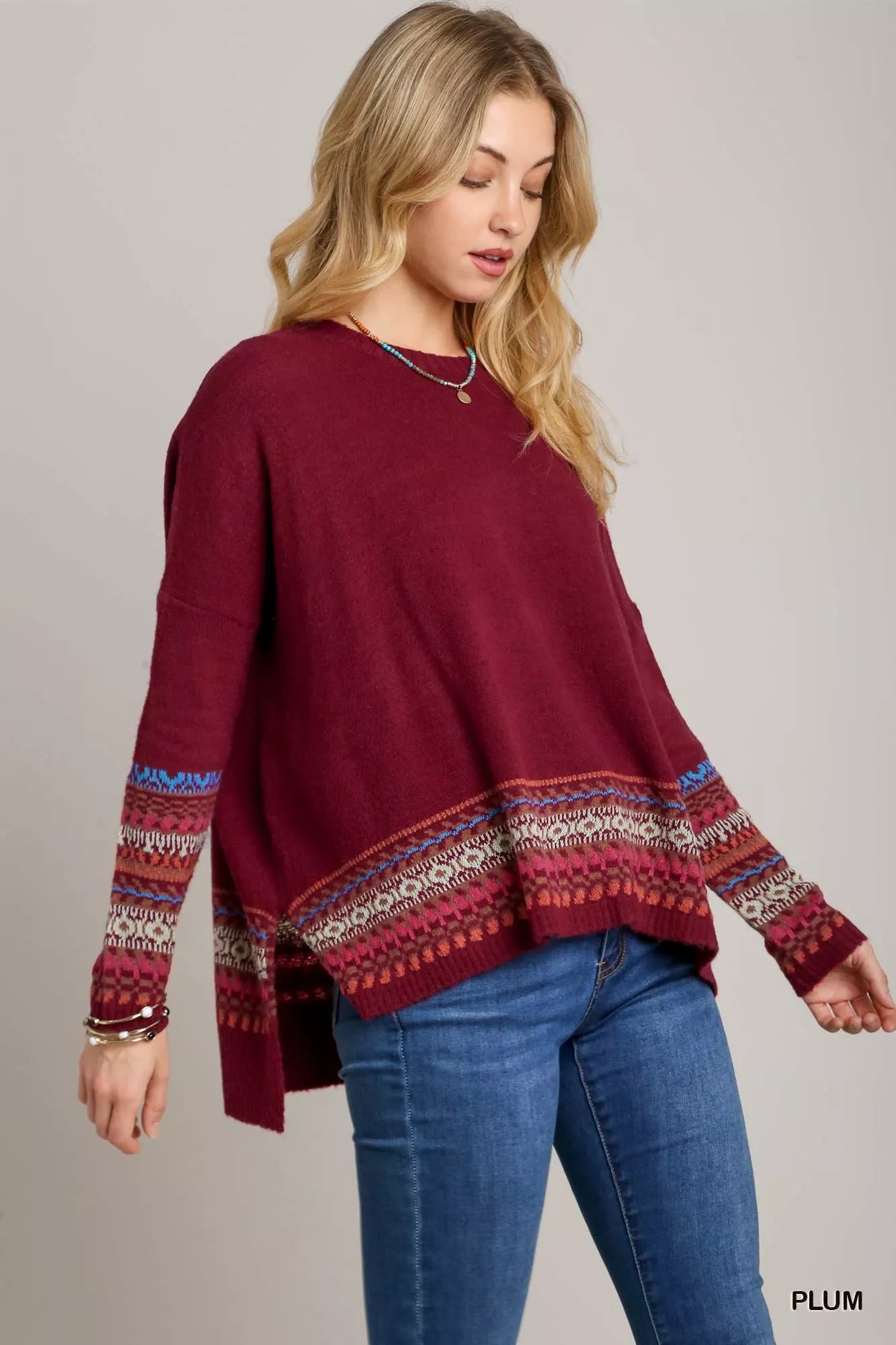 Umgee Long Sleeve Round Neck Knit Top with Side Slits and Stitch Detail